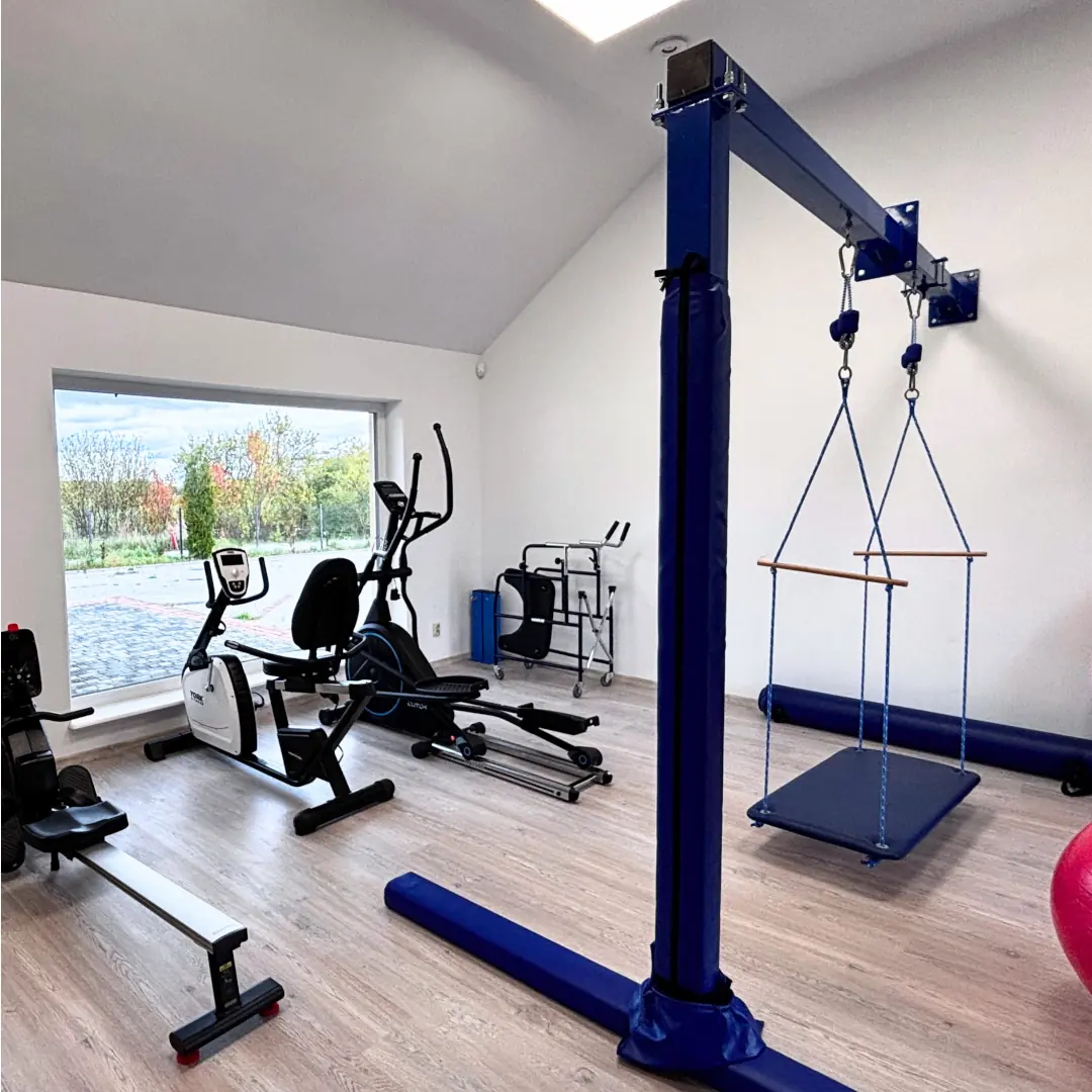 W przychodni znajduje się również sala do ćwiczeń - wyposażona jest w sprzęt wspierający terapię ruchową - urządzenia do treningu kondycyjnego i poprawy mobilności, stanowiska wzmacniające mięśnie głębokie, elementy do pracy nad równowagą i koordynacją oraz akcesoria do ćwiczeń funkcjonalnych.
